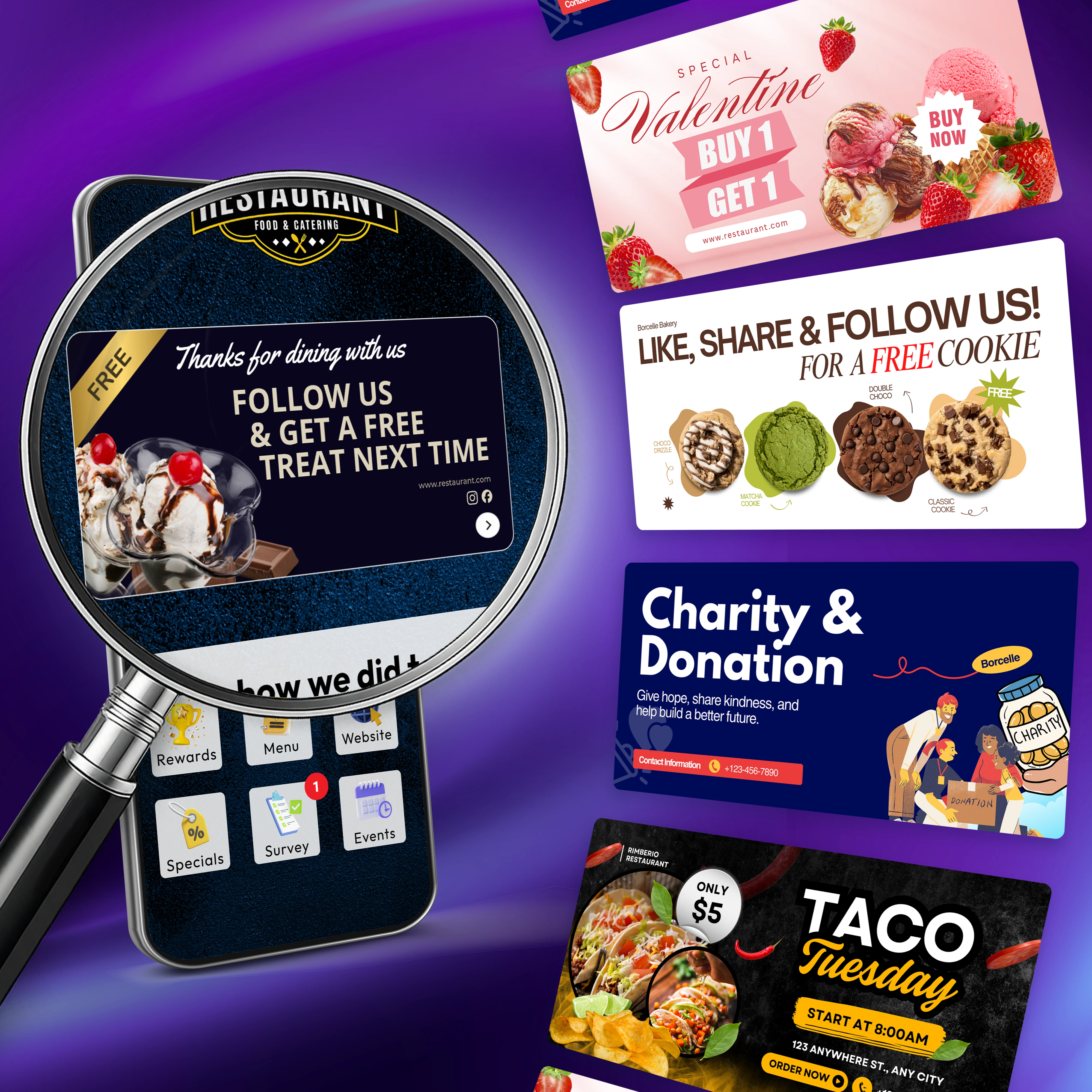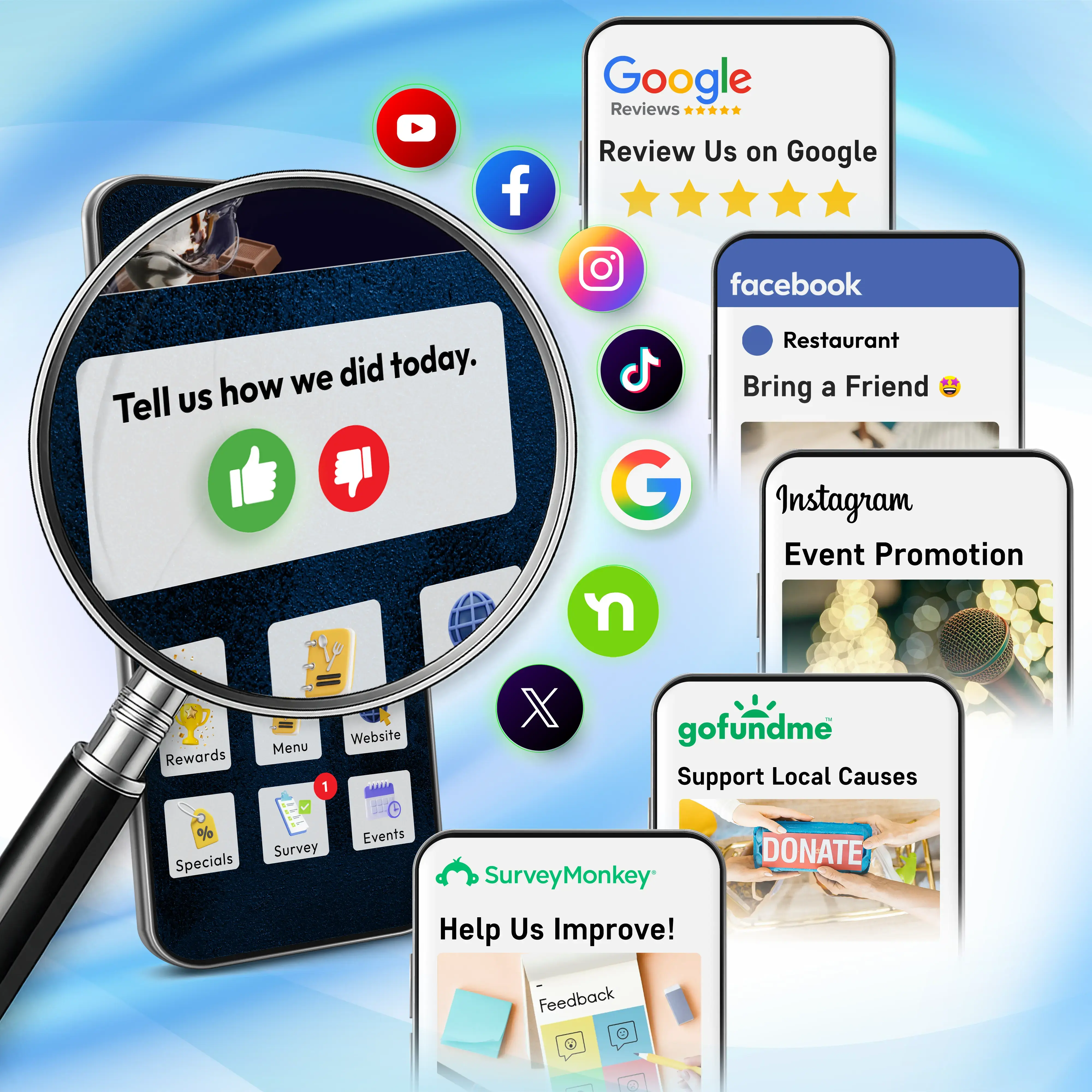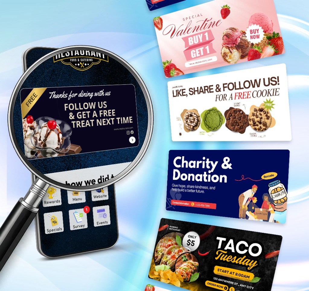Promote offers, rewards, events, and campaigns right at the table, while guests are engaged.